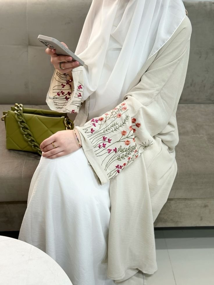 The abaya is tailored to provide a modest fit without compromising on style. Featuring intricate flower designs on the sleeves, it’s perfect for formal gatherings or casual outings, offering timeless beauty for all occasions.